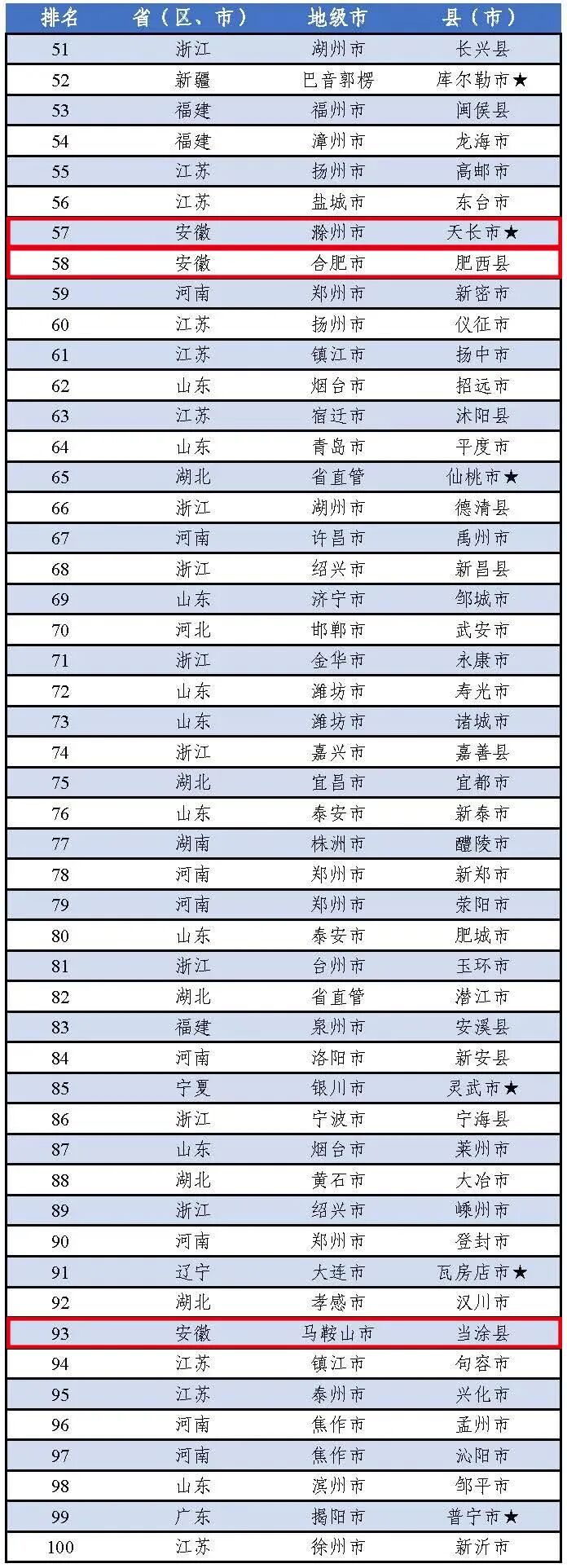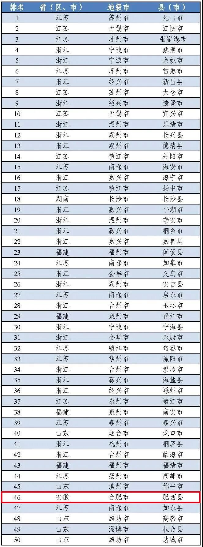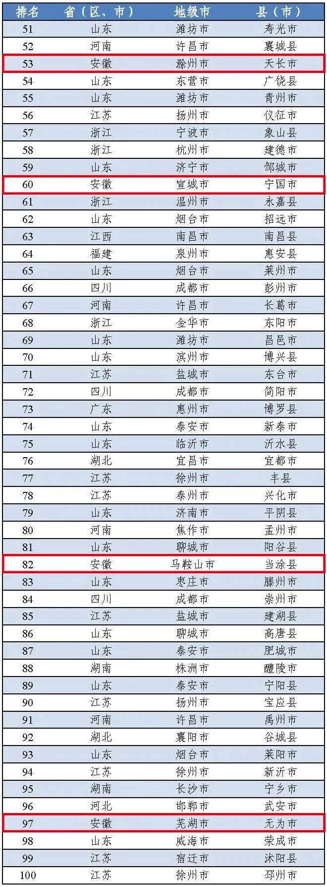 根据榜单显示,安徽滁州天长市、安徽合肥肥西县、安徽马鞍山当涂县入选2020年“中国工业百强县(市)”,分列57位、58位和93位;安徽合肥肥西县、安徽滁州天长市、安徽宣城宁国市、安徽马鞍山当涂县、安徽芜湖无为市入选2020年“中国创新百强县(市)”。