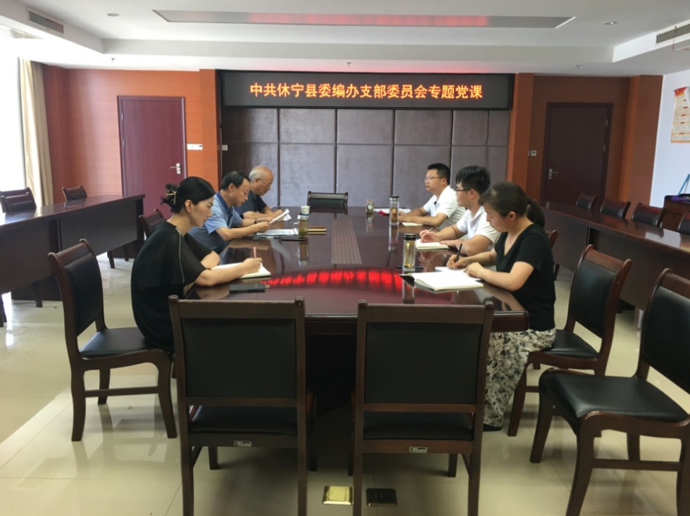 6月29日上午,休宁县委编办党支部书记黄九围绕新时代共产党员如何提升“四种能力”抓好党史学习教育,给全体党员干部讲授了一堂党史专题党课。