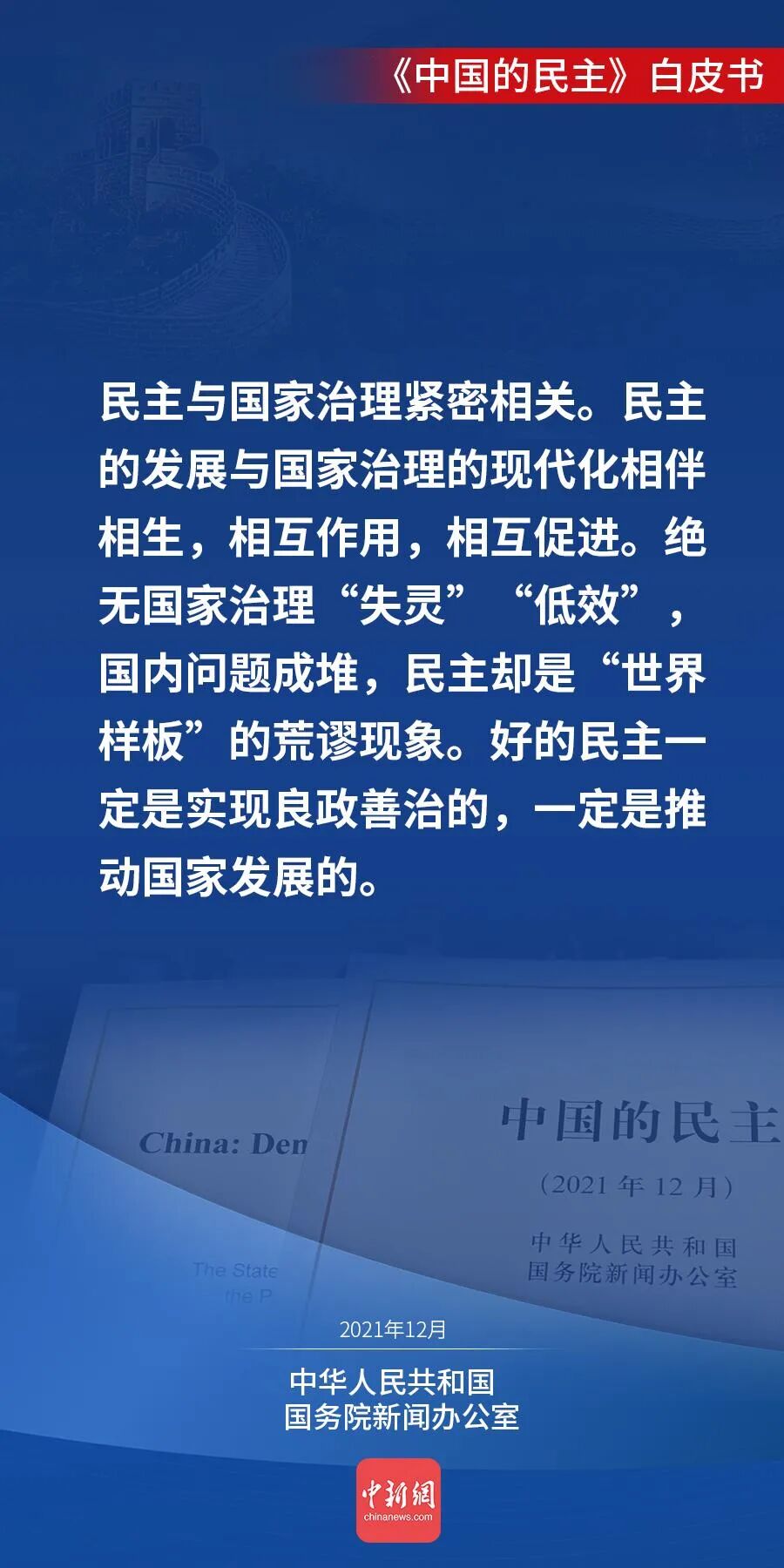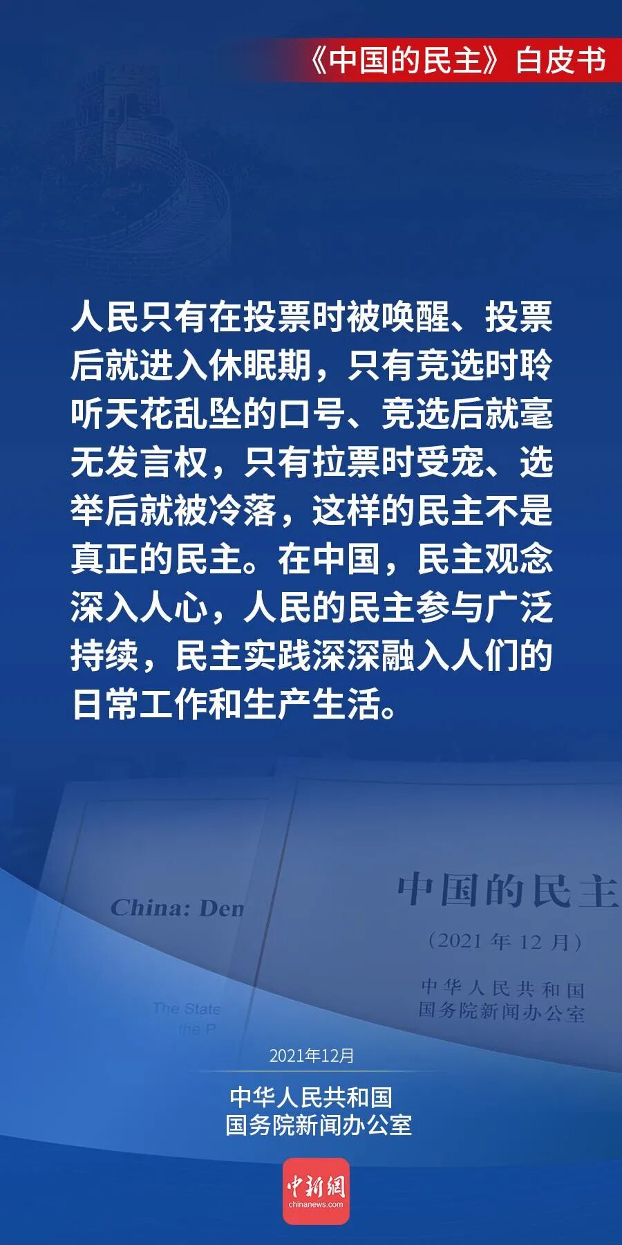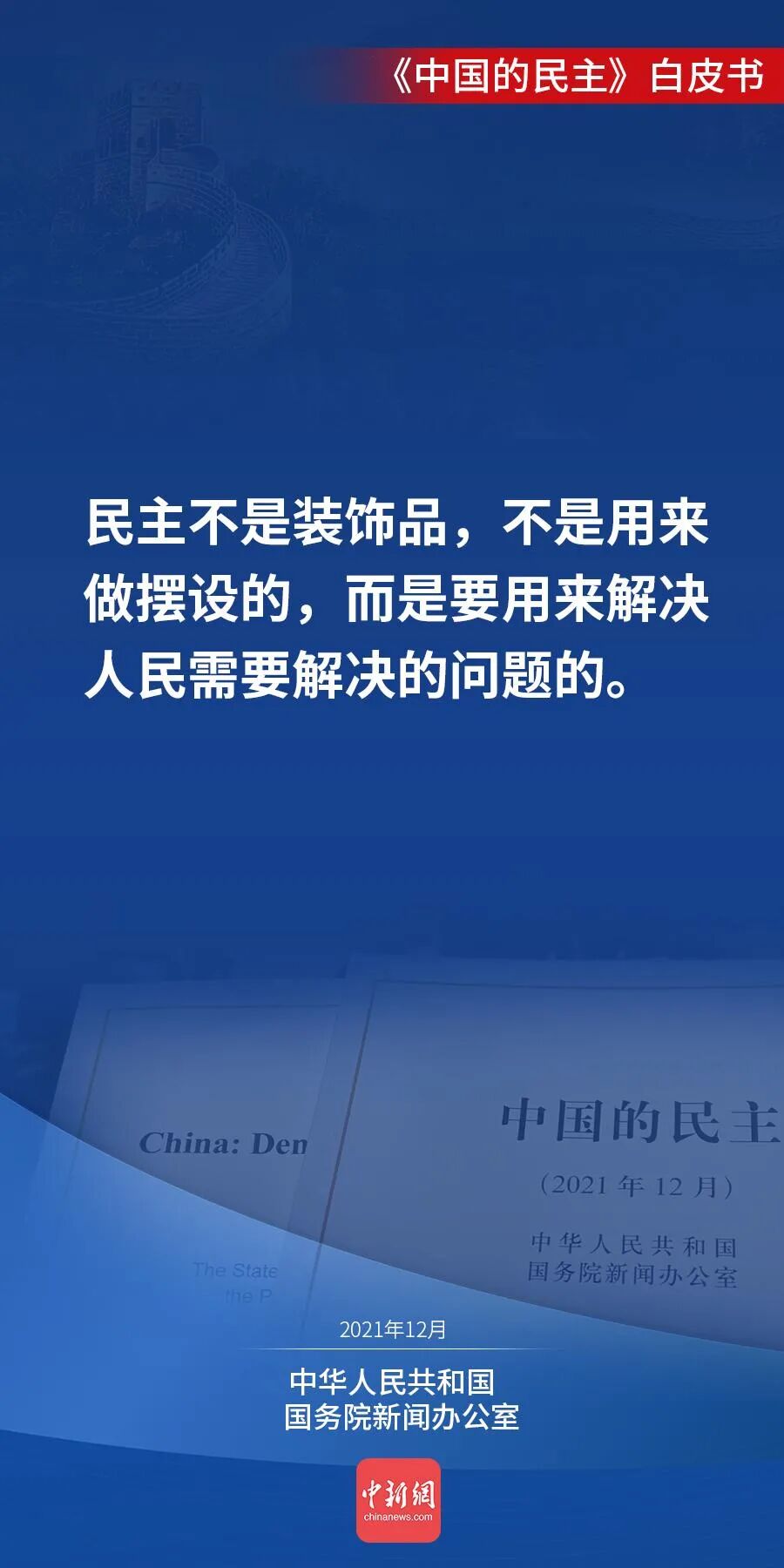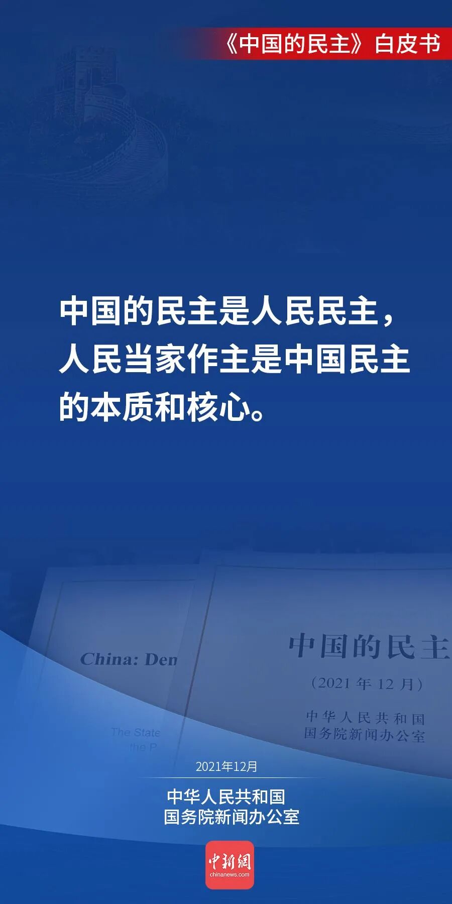 国务院新闻办公室12月4日发表《中国的民主》白皮书。白皮书说,人民当家作主,是中国民主的初心。今天的中国,人民当家作主的内涵不断丰富、渠道不断拓宽、效能不断提升,中国民主不断向前推进。↓↓↓
