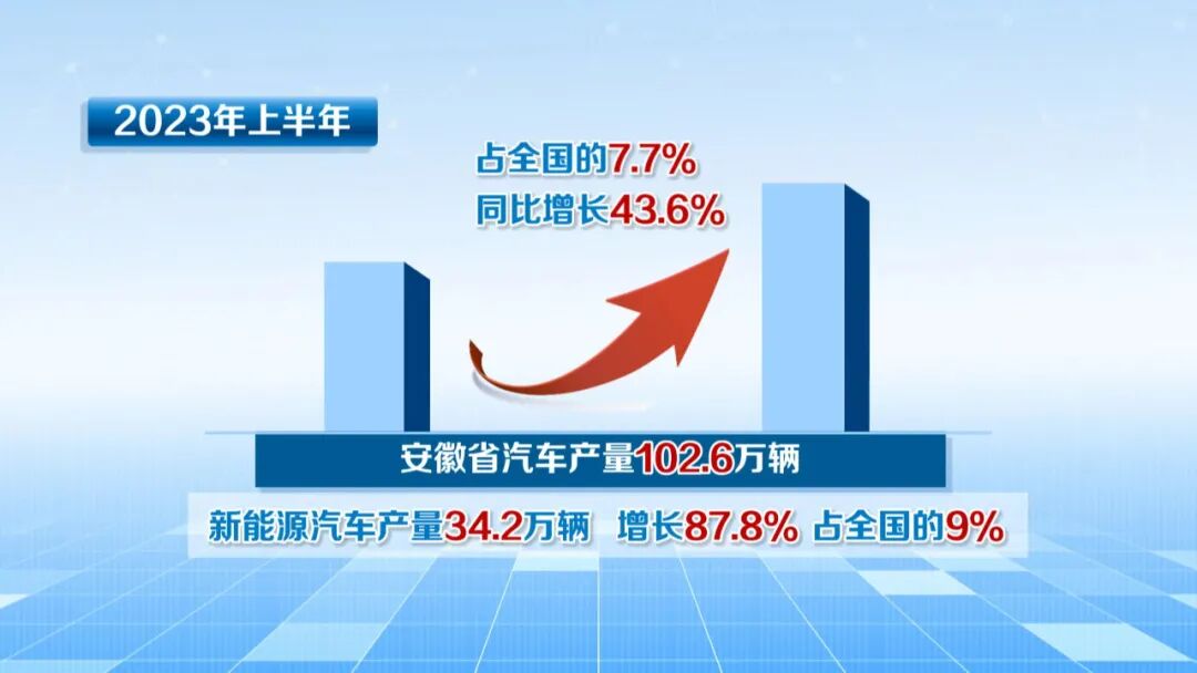 在金融、政策、人才等领域的支持不断加码,让安徽新能源汽车产业发展正驶入“快车道”,今年上半年,全省汽车产量102.6万辆,同比增长43.6%,占全国的7.7%;其中新能源汽车产量34.2万辆,增长87.8%,占全国的9%。