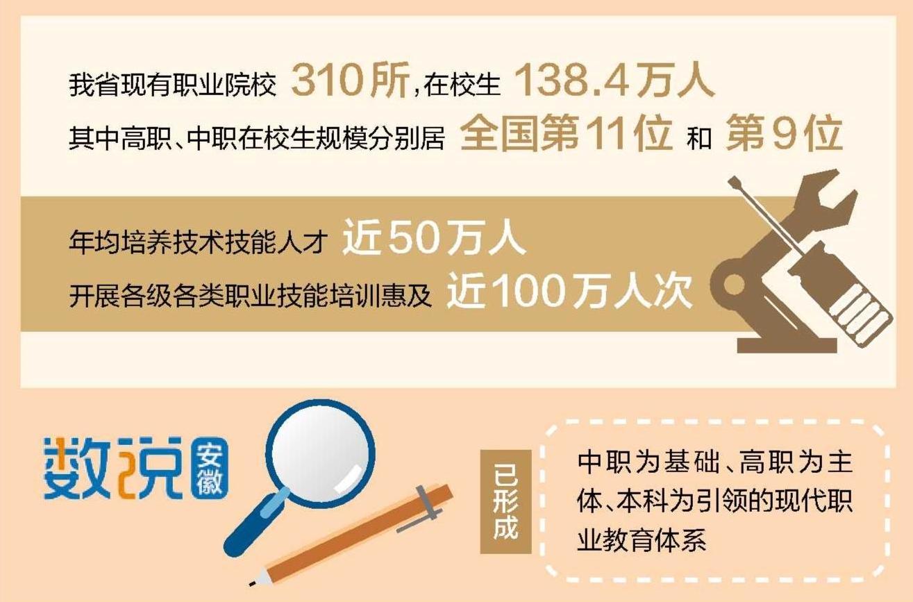 我省现有包括本科、高职、中职在内的不同层次职业院校310所,专业布点6058个,在校生138.4万人,其中高职、中职在校生规模分别居全国第11位和第9位,年均培养技术技能人才近50万人、开展各级各类职业技能培训惠及近100万人次,已形成中职为基础、高职为主体、本科为引领的现代职业教育体系。