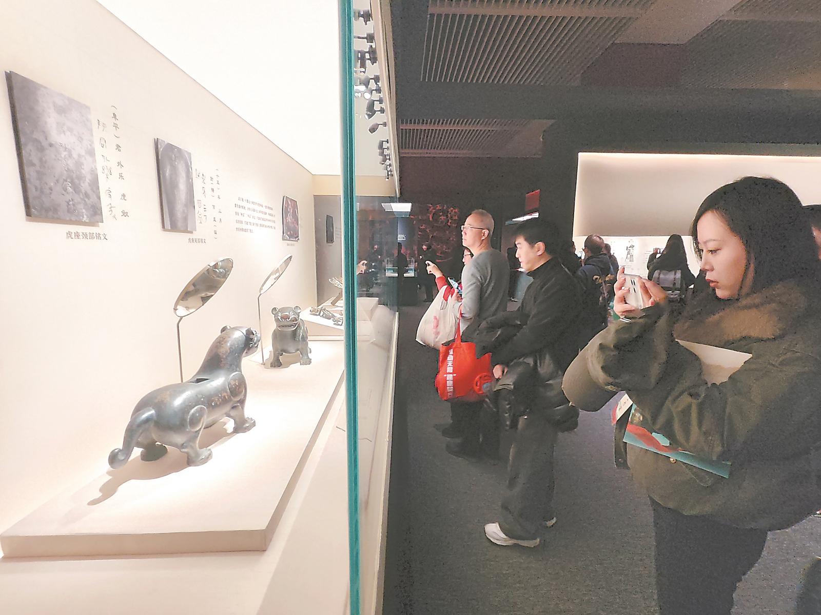 游客在中国国家博物馆参观武王墩一号墓出土的青铜虎座。