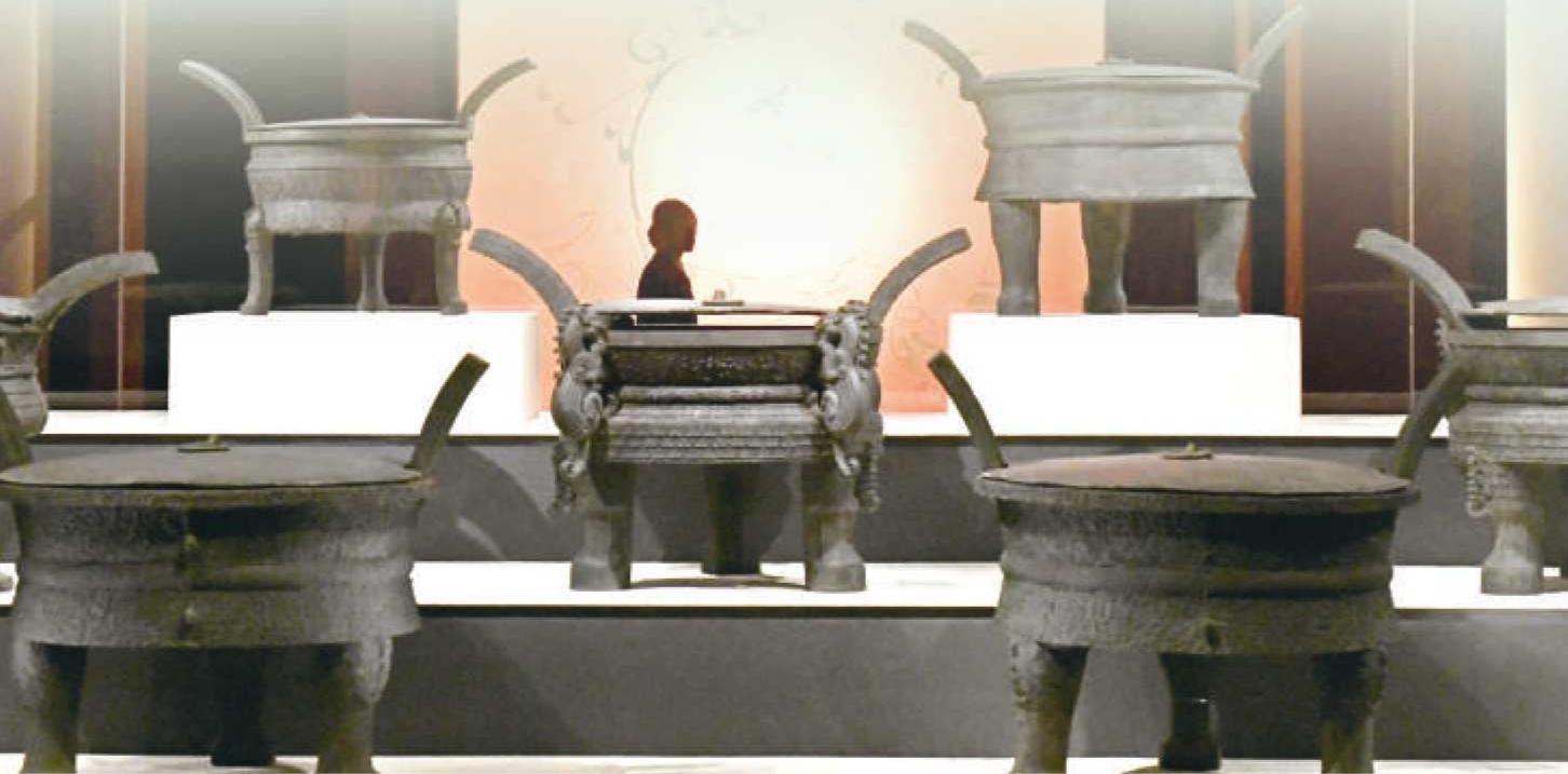 游客在中国国家博物馆参观武王墩一号墓出土的天子九鼎。