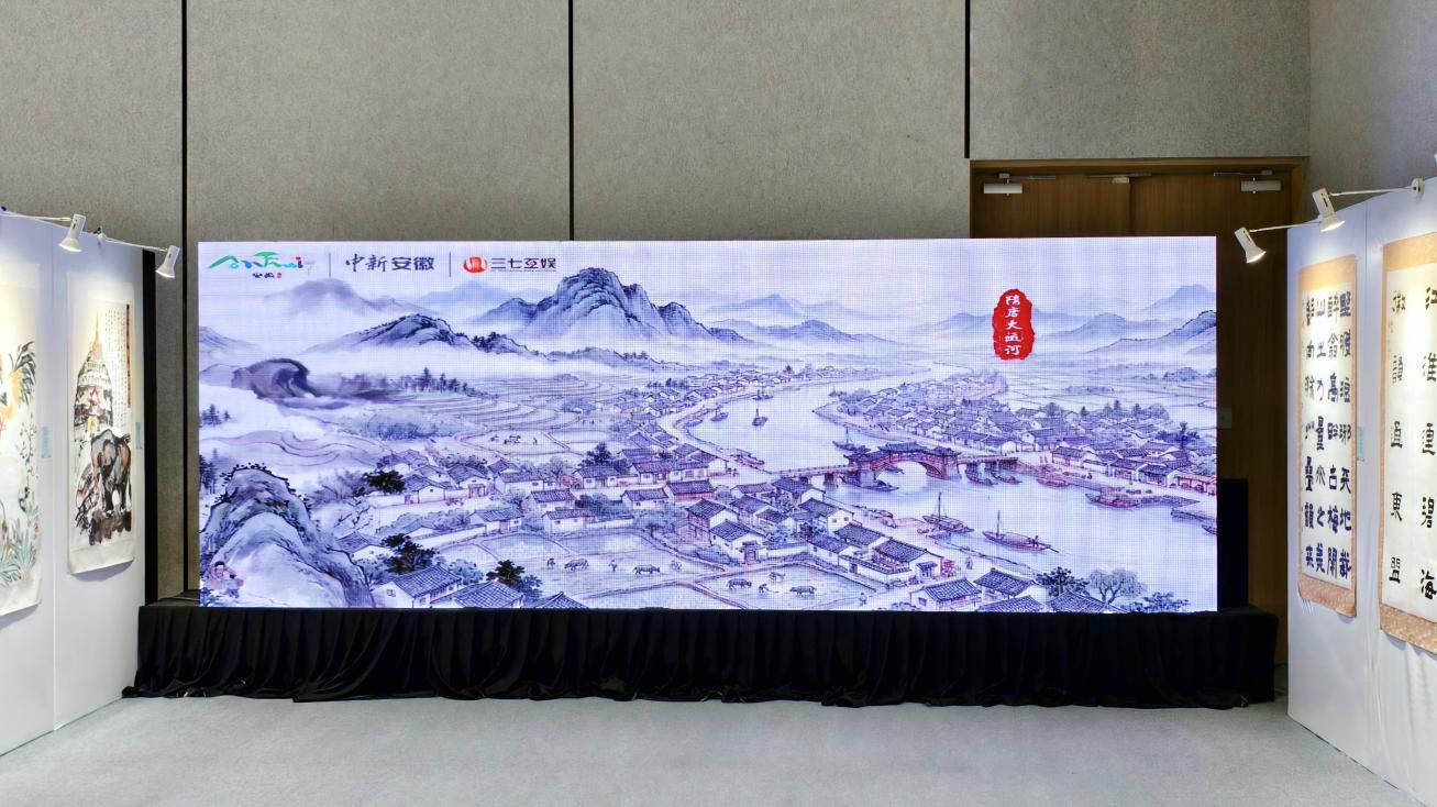 在“欢乐春节·美好安徽走进马来西亚”文旅推介会暨“皖美如画·RCEP成员国华人书画大赛”优秀作品展启动仪式以及“时代徽印”文房四宝博览会上,两幅融合AI技术与水墨意境的全息长卷在高6米、宽2.5米的屏幕上缓缓滚动、动态呈现,引得现场嘉宾驻足围观。