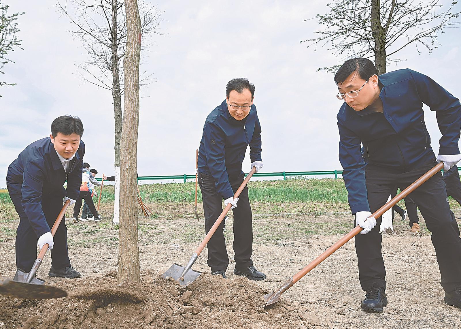 随后,梁言顺、王清宪、张西明等省领导走向植树区域,与干部群众一起挥锹铲土、扶正苗木、培土围堰、提水浇灌,合力栽种乌桕、水杉、湿地松等树苗。经过一番劳动,新种下的一株株苗木挺立舒展、错落有致,在春光里焕发出勃勃生机。植树间隙,梁言顺强调,植树造林是一项功在当代、利在千秋的崇高事业,要咬定青山不放松、一代接着一代干,统筹利用绿色空间,科学选种适生树种,强化造林质量监管,加大苗木管护力度,因地制宜做好增绿文章。要结合农村人居环境整治大力推动村庄绿化美化,加快建设一批城市社区公园、街头游园和“口袋公园”,让城乡居民有更多的绿色获得感。要创新工作机制,加强宣传教育,科学、节俭、务实组织开展义务植树活动,激发全社会参与造林绿化的积极性和主动性。